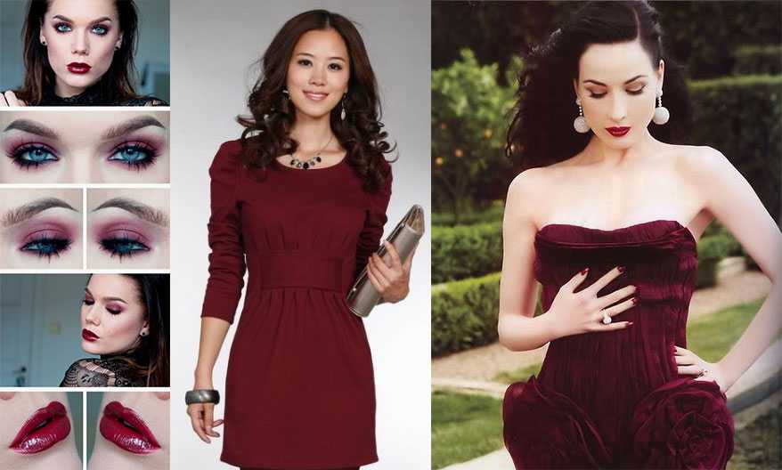Вероятно, вы уже поняли, что дневной макияж к бордовому платью лучше сделать с акцентом на глаза, используя холодные оттенки розового, бордового, бежевого, коричневого, серого или чёрного. Конкретный выбор зависит от цвета ваших волос, оттенка кожи и предпочтений. Кстати окажутся такие косметические приёмы: