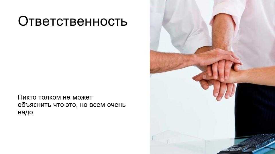 Я часто работаю с менеджерами – нижестоящими и вышестоящими. Почему-то люди очень часто вообще не понимают, что такое ответственность. Когда я обсуждаю этот вопрос с менеджерами, часто происходит такой диалог: