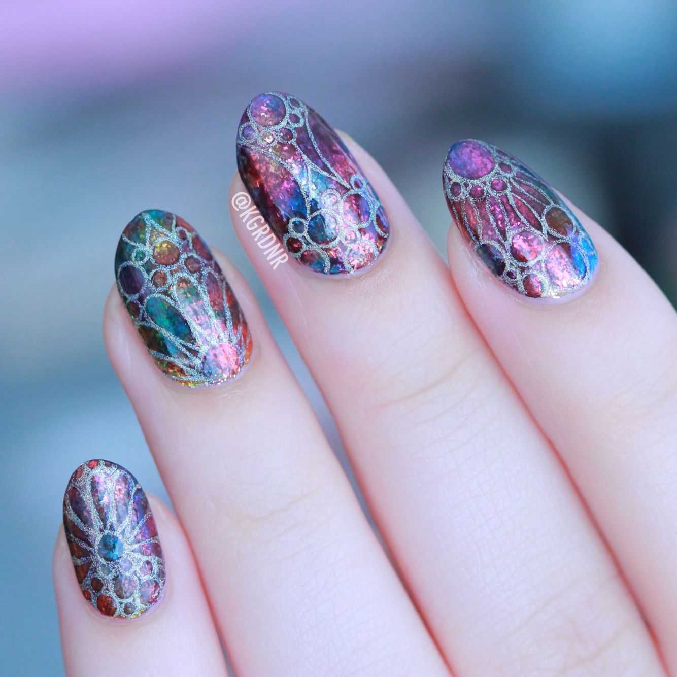 Витражные лаки шикарно выглядят на серебристой и зеркальной подложке. В таком сочетании прозрачные витражные краски смотрятся очень нежно и красиво, они насыщают основной оттенок, делают его глубже и ярче.