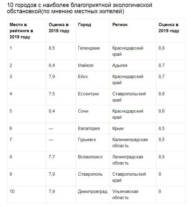 Кроме того, есть рейтинги, составленные на основе опроса жителей и их субъективной оценки экологической ситуации там, где они проживают. Правда, от интервьюируемых требовалось указать причины, по которым они выставили своему городу ту или иную оценку по 10-балльной шкале . В итоге, города России по экологии и экологическому благополучию выстроились в следующем порядке:
