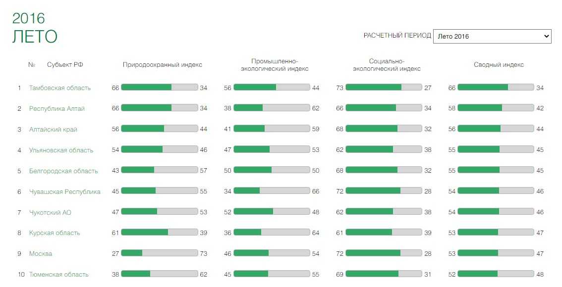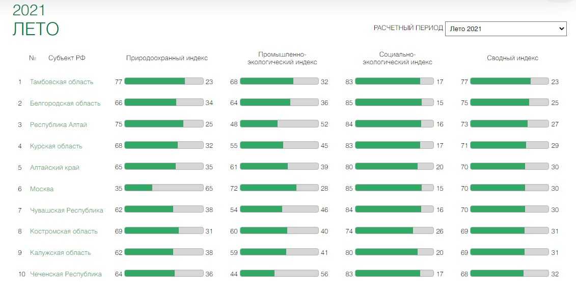 На основании полученных данных выводится сводный индекс, на основании которого региону присваивают место в рейтинге. Полный итоговый экологический рейтинг за лето 2021 года можно увидеть здесь, а мы изучим десятку лидеров: