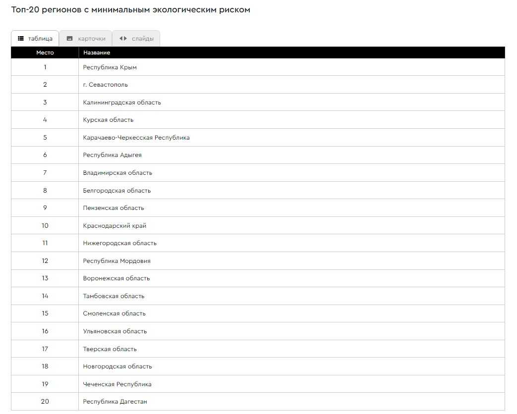 Разумеется, прочие организации тоже представляют свои рейтинги. Результаты серьезно разнятся из-за различий в использовании исходных данных и методике подсчета. Например, можно найти экологический рейтинг за 2020 год, где учтены выбросы в атмосферу, неочищенные стоки, мусор и радиация . Топ-20 регионов с минимальным экологическим риском в этом случае выглядит следующим образом: