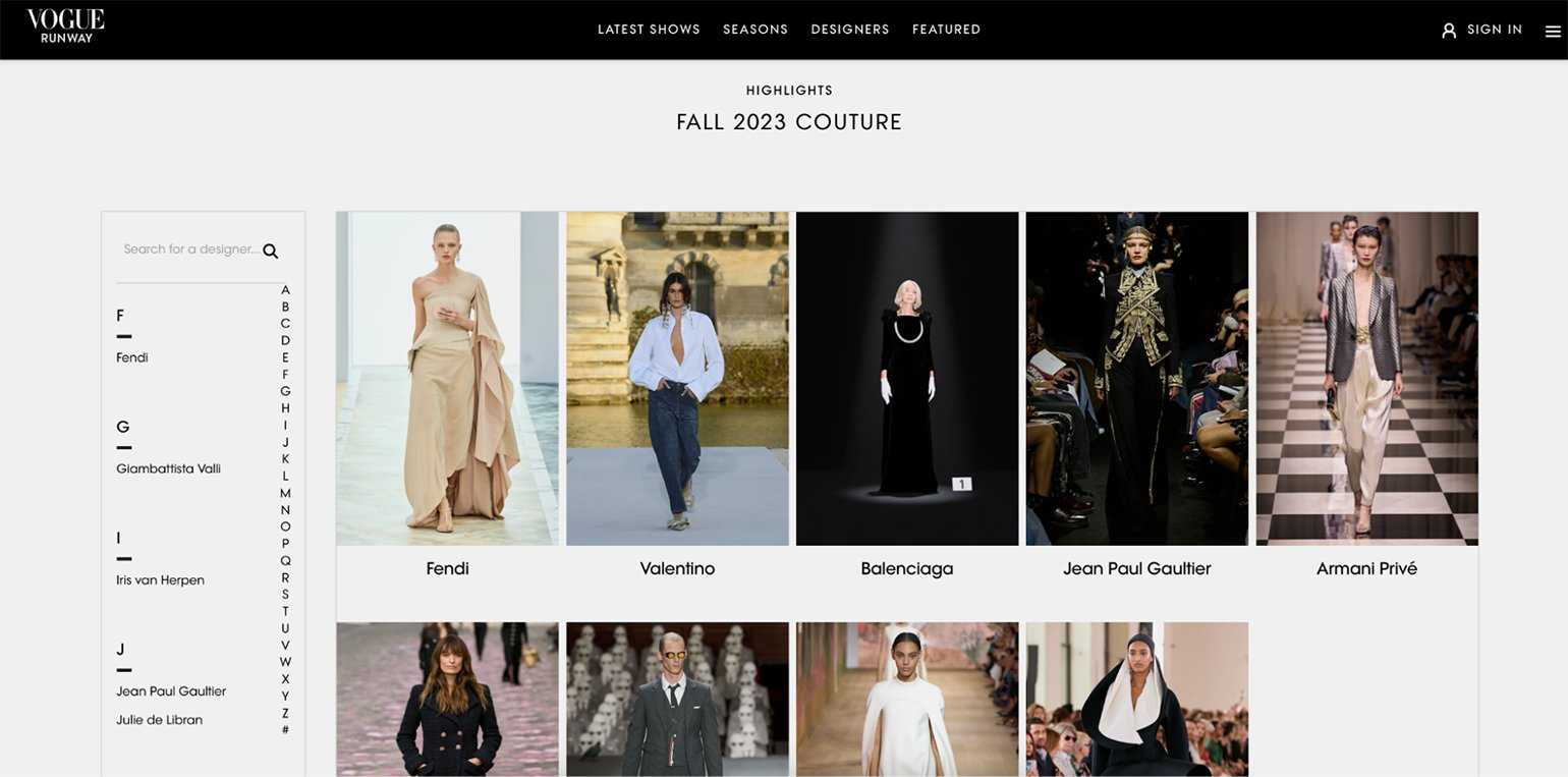 На Vogue Runway все фотоотчёты рассортированы по брендам, неделям моды, городам, годам. Можно рассмотреть, что представляют локальные малоизвестные марки, и изучить, какие есть особенности в стайлинге для разных культур — например, для Азии или арабских стран.