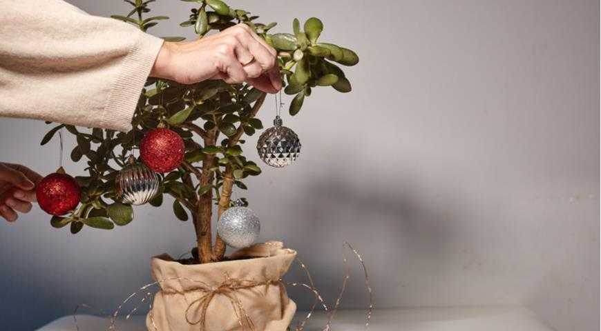 Привлекательный суккулент с красивыми листьями и нарядной внешностью будет хорошо держать легкие новогодние игрушки. Листья толстые, мясистые, глянцевые, зеленые с красноватыми краями. О том, как правильно подарить денежное дерево, вы можете узнать здесь >>>>