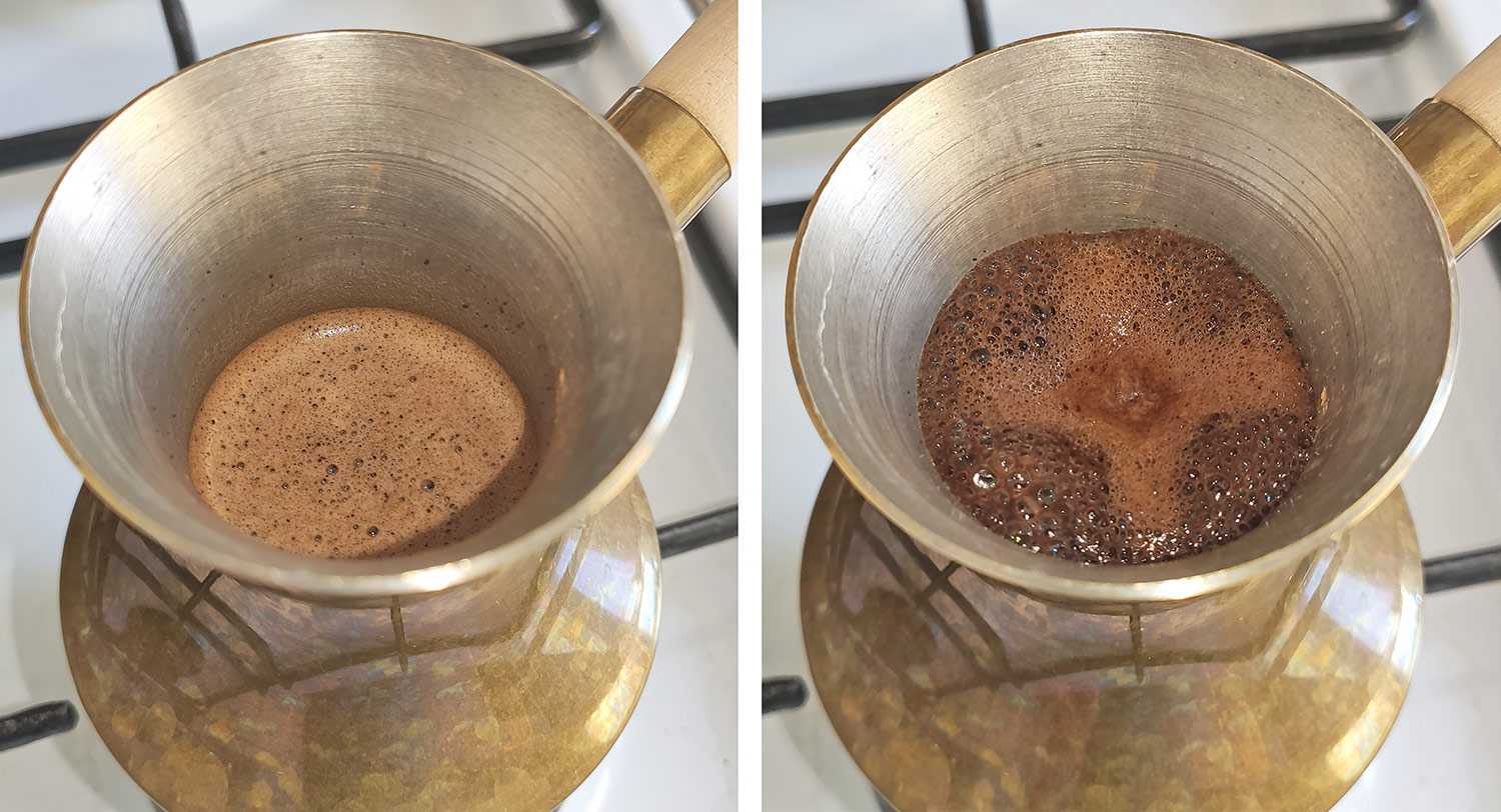 - Внимательно следите за образованием пенки. Как только она появится, убирайте с конфорки. Не допускайте закипания смеси. Повторив так 2-3 раза, вы получите более глубокий вкус.