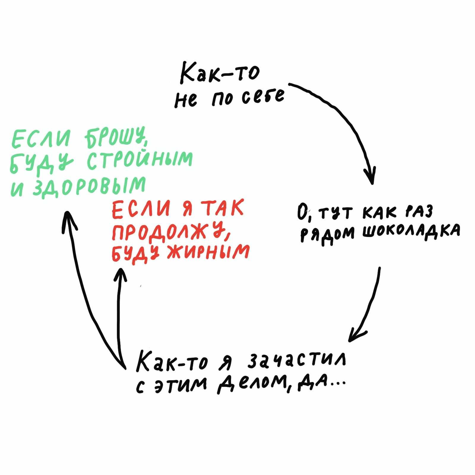 Когда человек говорит себе «Разочек можно», он часто забывает, что такой же разочек был вчера, позавчера и на прошлой неделе. Дневник поможет посмотреть на ситуацию без когнитивных искажений.