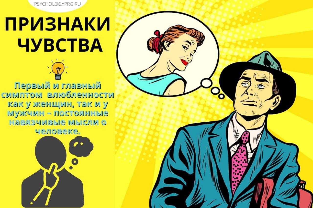 Первый и главный симптом влюбленности как у женщин, так и у мужчин – постоянные навязчивые мысли о человеке. Они преследуют вас в фоновом режиме, а периодически занимают все ваше сознание. Но вы от этих мыслей не отмахиваетесь – они щекочут ваши нервы, вам приятно.