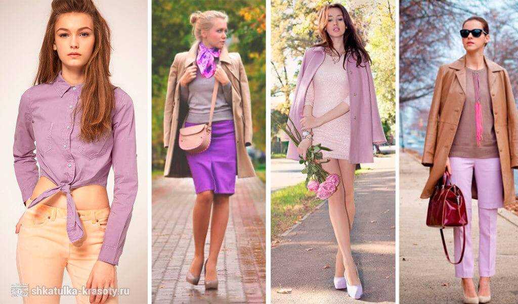 Лилово-розовый сочетается с розовым: бело-лиловым, лиловым, темно-лиловым, пурпурно-розовым, малиновым. База: цвет белой цапли, светлый коричнево-бежевый, мокрый асфальт.