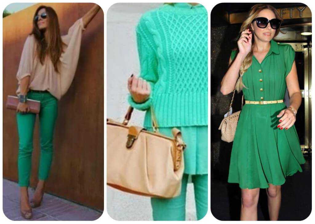 Наиболее сочетаемыми являются яркий малахит, прозрачный изумруд и беж. Эти комбинации создала сама природа, поэтому органичность тандема вполне объяснима. Дуэт больше подходит для повседневной одежды – офисные, прогулочные варианты.
