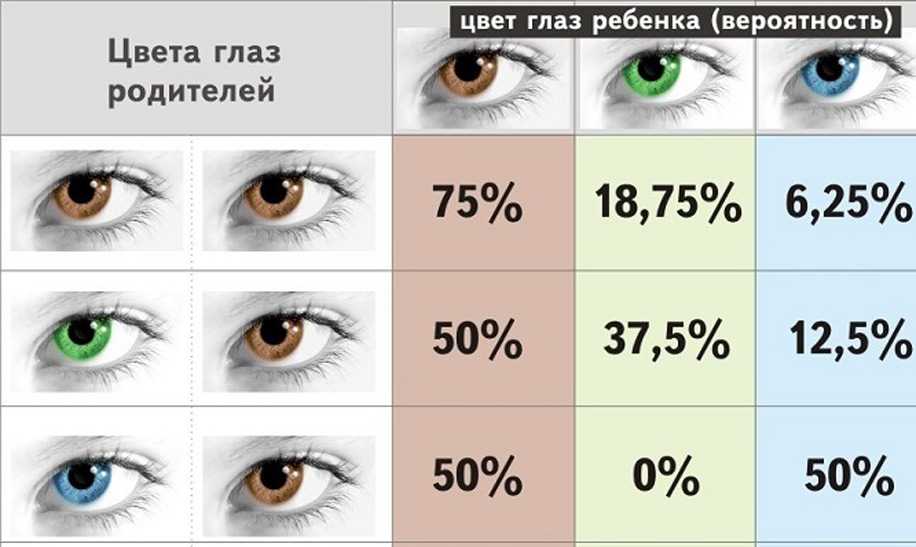 - Генетика. Гены играют немалую роль в том, какие глаза будут у ребенка, но на 100% с помощью генетики предсказать цвет глаз невозможно. Есть лишь примерные данные, которыми могут руководствоваться родители. Так, например, вероятность того, что у светлоглазых мамы и папы родится малыш со светлыми глазами, составляет 75%. Если у одного из родителей глаза темные, скорее всего, у их ребенка будут карие глаза.