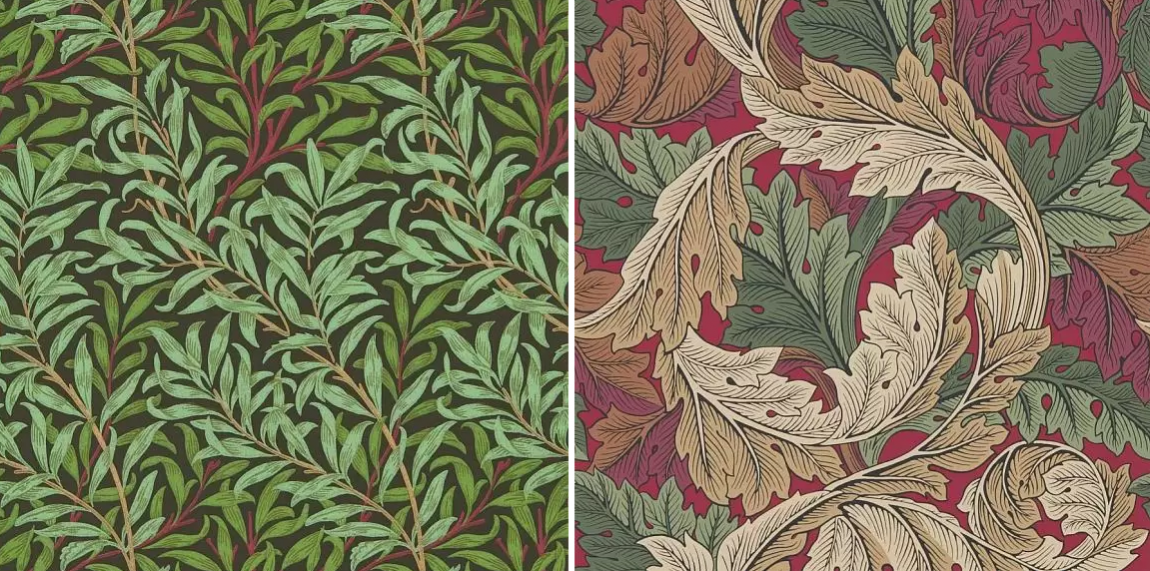 - в викторианском стиле часто можно встретить следующие сочетания узоров: благоухающие сады, птицы на ветках, цветы (популярные представители ‒ клевер, ландыш), шотландская клетка, лесные ягоды;
