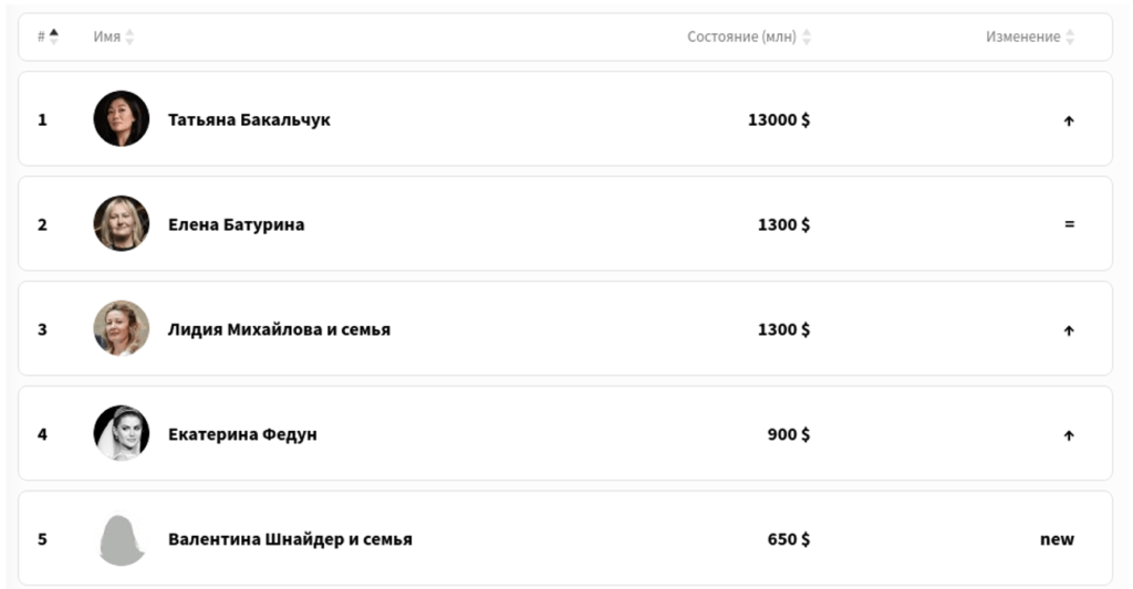 Елена Батурина, бывшая супруга бывшего мэра Москвы Юрия Лужкова, и основательница «Интеко», расположилась на шестом месте с состоянием в 1,3 миллиарда долларов. За ней следуют дочь Леонида Михельсона, основателя «Новатэка», Виктория Михельсон (1,2 миллиарда долларов), Евгения Гурьева, жена основателя «Фосагро» Андрея Гурьева (875 миллионов долларов), дочь Леонида Федуна, совладельца «Лукойл», Екатерина Федун (800 миллионов долларов), и Людмила Коган, вдова бизнесмена Владимира Когана, наследовавшая его активы в «Уралсибе» (725 миллионов долларов).