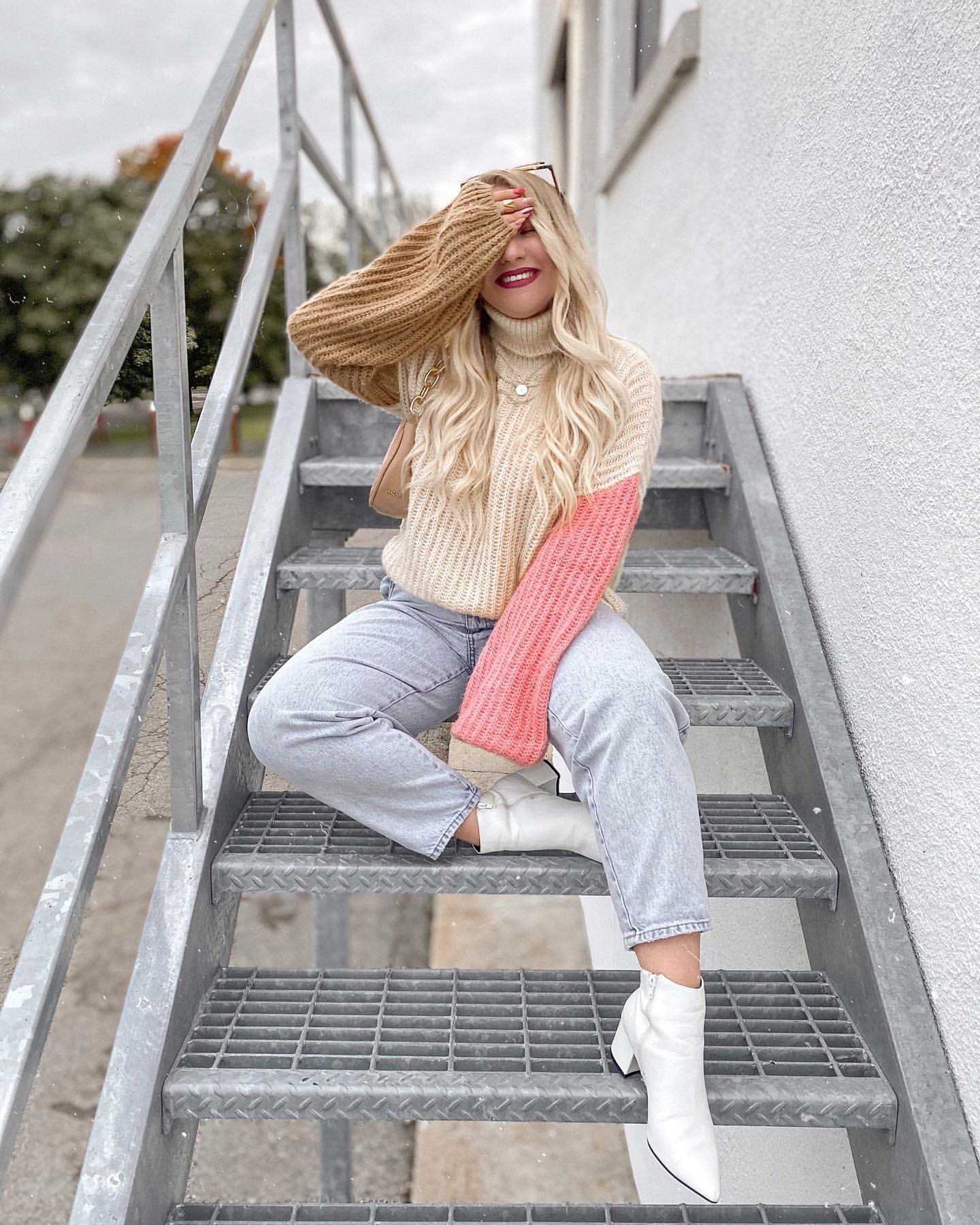 Последний образ с джинсами — это комбинация спокойного серого и пудрового. Доставайте свои минималистичные босоножки, любимые джинсы и аккуратную сумочку — будете самой модной. Я добавила еще много браслетов на запястье. А под свитерок можно надеть красивое кружевное белье и приоткрыть плечико.