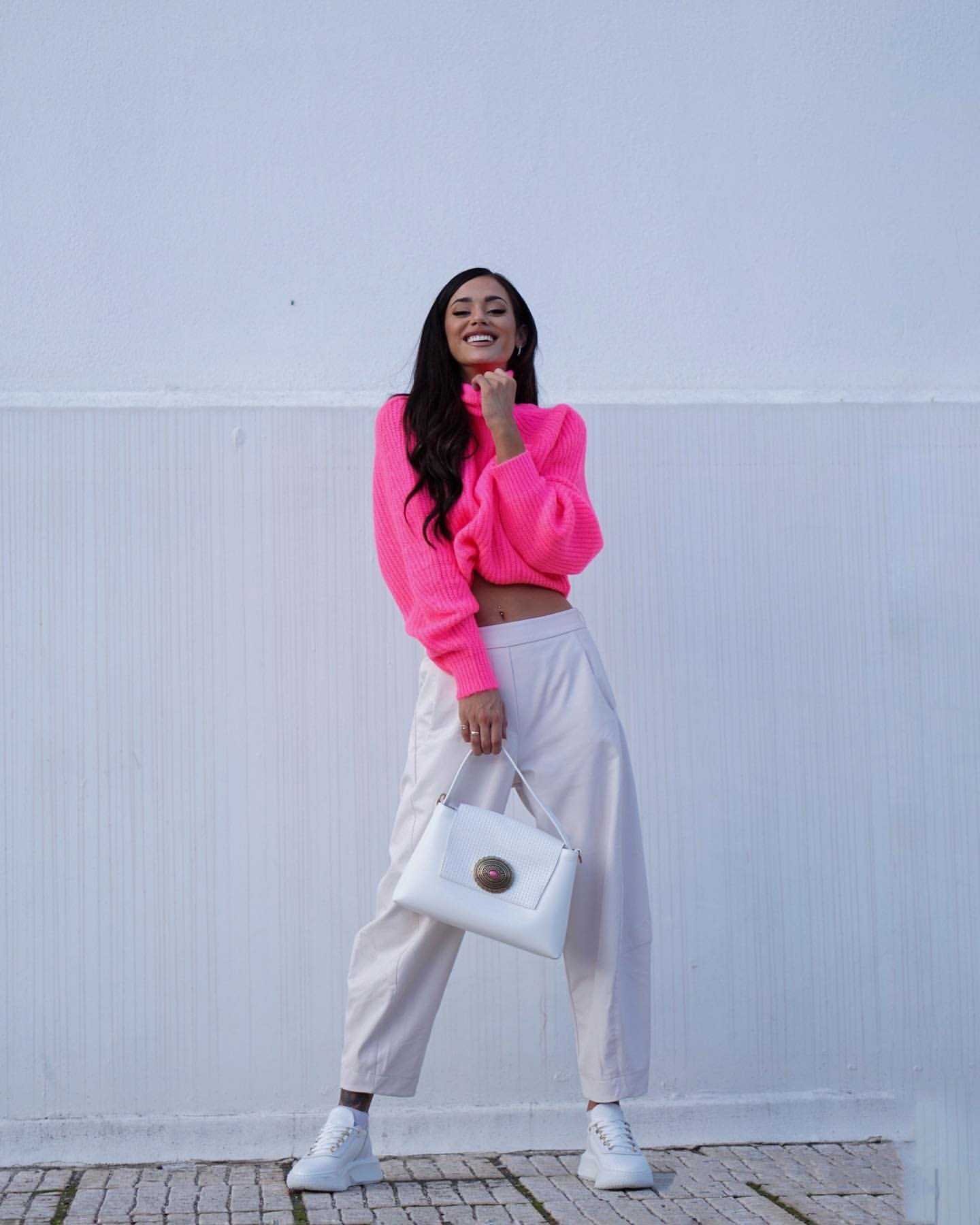 В 2023 году особую популярность имеет белая обувь, как раз таки именно она и сделает образы со светлыми свитерами более целостными и максимально продуманными