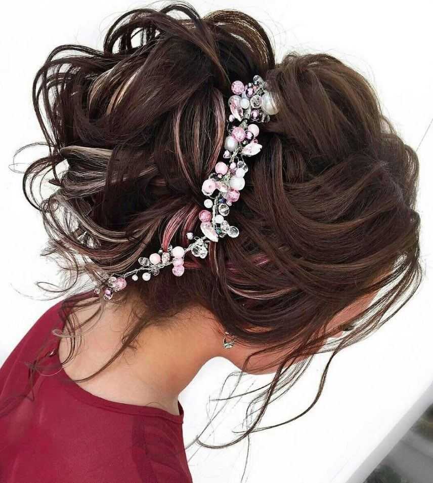 В списке востребованных вариантов всевозможные пучки и ракушки с небольшим объёмом в прикорневой зоне, свободно свисающими или аккуратно зачёсанными прядями, греческие плетения, выполненные на распушенных и завитых волосах и объёмные косы с вытянутыми звеньями, красиво уложенные в венок. А также различные хвосты и жгуты, которые обязательно украшаются цветами в тон свадебному букету, сверкающими диадемами, заколками, лентами и жемчугом.