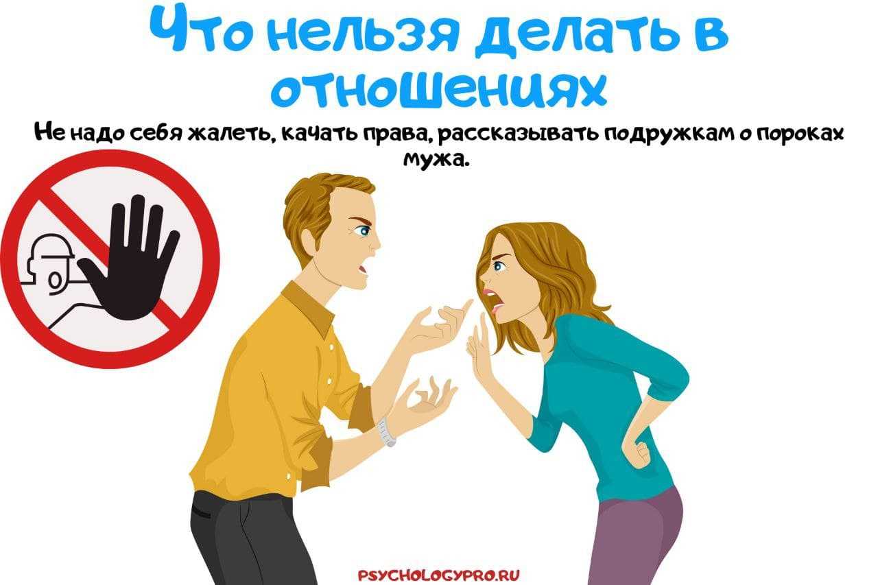 Не надо себя жалеть, качать права, рассказывать подружкам о пороках мужа. Не зная, как изменить ситуацию, девушки нередко включают женский арсенал воздействия. Это истерики, брюзжание, хлопанье дверью, обиды и требование доказательств любви. Обо всем этом надо навсегда забыть – мужчины воспринимают это как прессинг, которого они не переносят. Реакцией будет побег в себя.