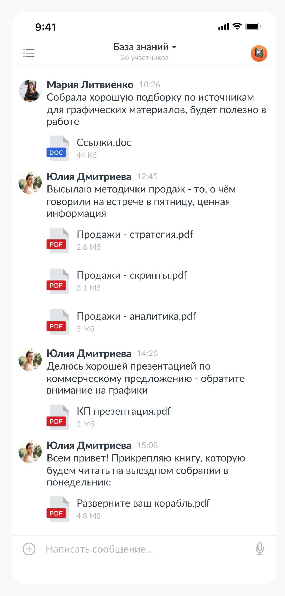 Соберите базу знаний в отдельном чате в корпоративном мессенджере — сохраните в нем все полезные материалы, и они всегда будут под рукой.