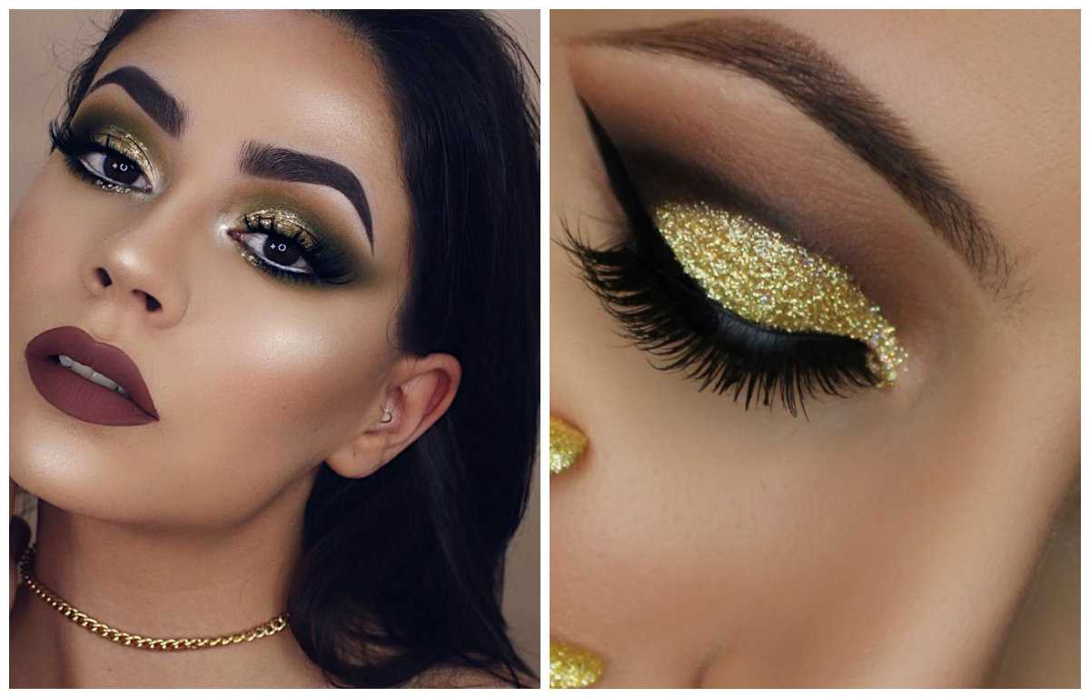 Новогодний макияж для зеленых глаз предполагает использование блестящих теней. Актуальные оттенки — золотой, коричневый, зеленый.