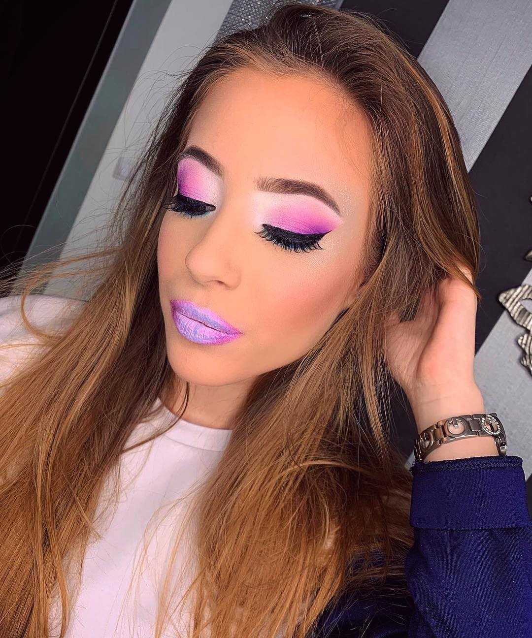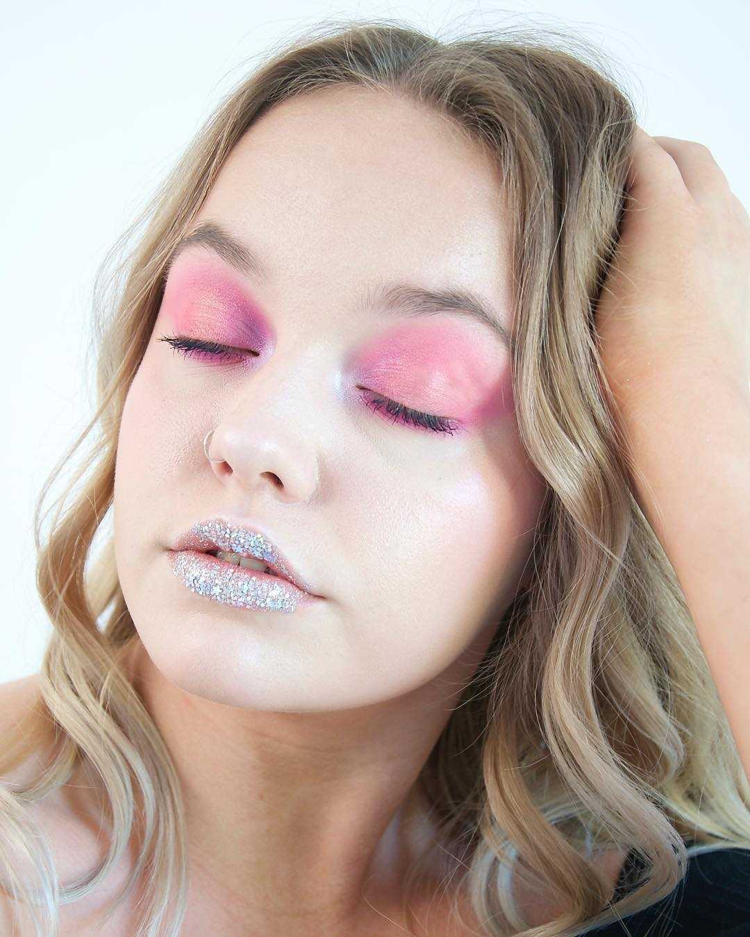 Свежие розовые, лиловые оттенки для губ, натуральные нежно-розовые либо персиковые румяна, тени с некоторым отливом металлики.
