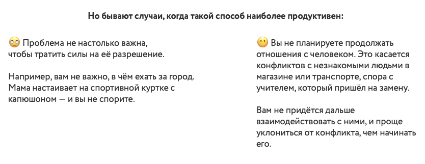 Уклонение, как и приспособление, — не лучший стиль поведения в конфликте. Вы не решаете проблему, не взаимодействуете с другими и не получаете новый полезный опыт.