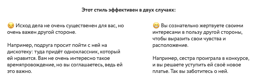 В остальных случаях приспособление обычно приводит к тому, что человек чувствует себя жертвой, перестаёт получать удовольствие от общения или начинает злиться. Часто в таких случаях конфликт всё равно возникает, но по менее важным поводам. Чтобы этого не происходило, стремитесь к сотрудничеству или компромиссу.