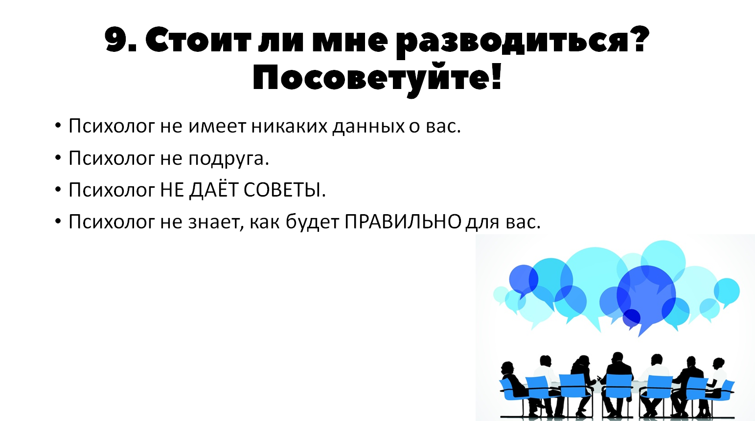 У психолога никогда нет никаких конкретных данных по вас и вашей жизни. Как без этой информации можно давать какие-то советы? Здесь есть искажения, о которых мы говорили, вы можете что-то скрывать, чего-то вы можете не знать, а я – тем более. Что мне тут можно вам советовать? Когда я вам что-то советую, я беру ответственность за вас и вашу жизнь на себя. Я не сумасшедший человек, чтобы такое делать. Нормальный, квалифицированный психолог никогда не будет вам советовать, что вам делать со своей жизнью.