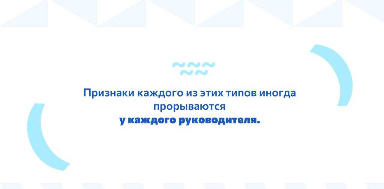 Исходя из собственного опыта, а он у меня достаточно богатый, признаки каждого из этих типов проявляются у каждого руководителя – просто у каждого это происходит в разной форме. Бывает, что смазано, бывает, что ярко.