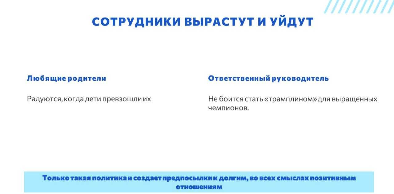 Возвращаясь к выращиванию сотрудников, руководитель должен стать трамплином для своих сотрудников – только такой подход позволяет работать с человеком вдолгую.