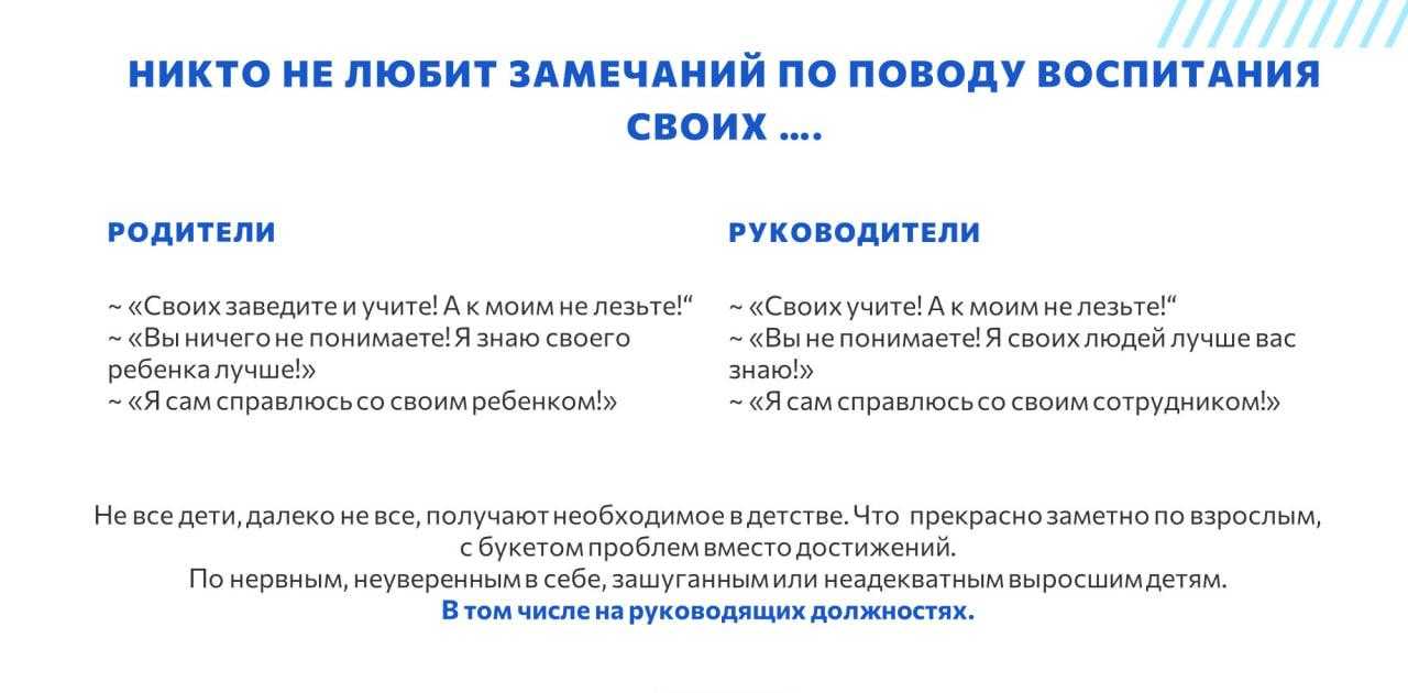 Многие дети перегружены, у них недостаток внимания родителей или наоборот, они привыкли к какому-то директивному управлению. И вырастают такие дети в зашуганных, неуверенных, с букетом комплексов, с наросшими поверх этого букета дополнительными веточками, проблемами. И эти люди иногда приходят на руководящие должности.