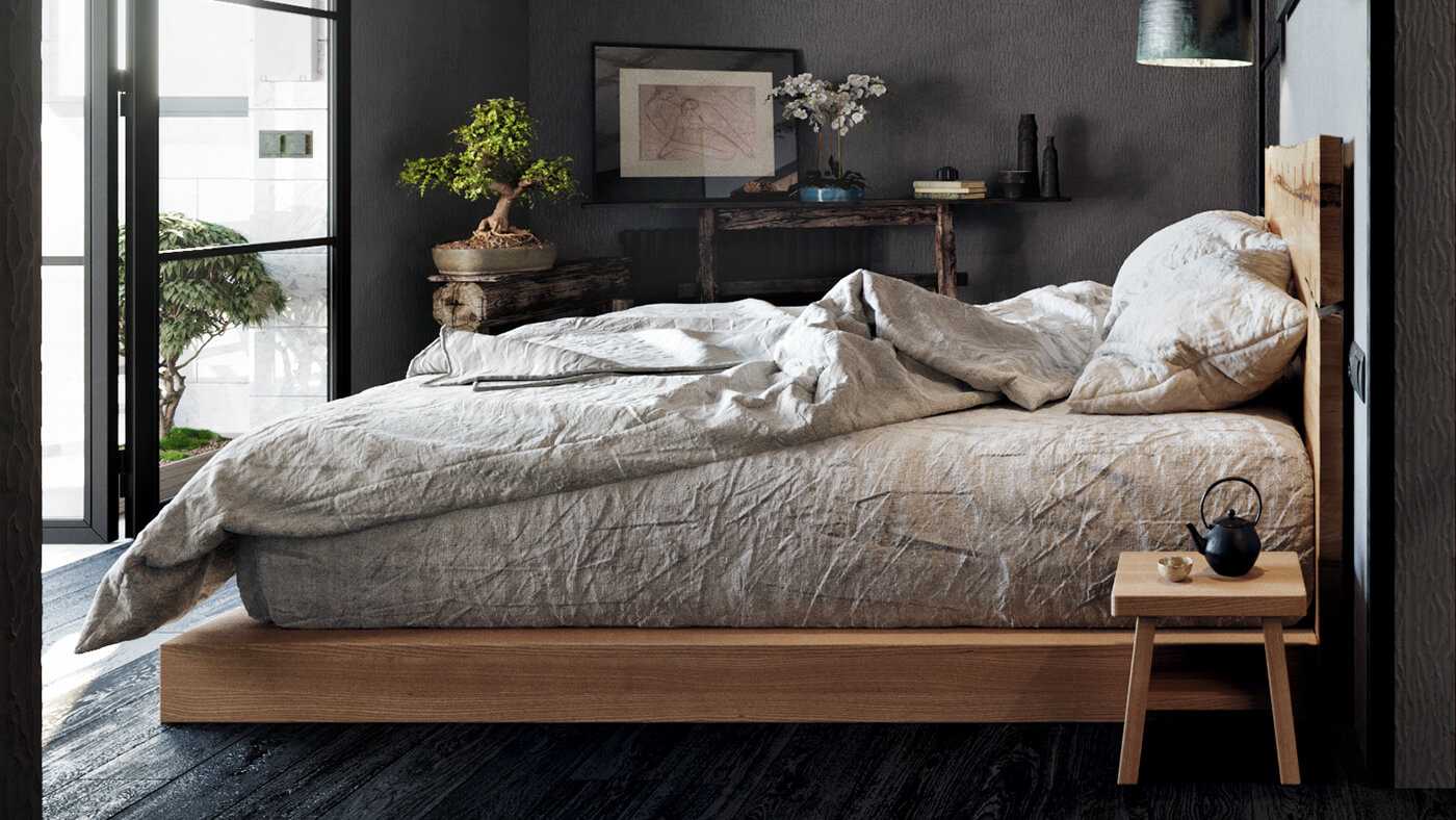 Дизайн японского стиля ваби-саби делает упор на спокойствие. Мебель должна быть удобной, низкой, простой. В спальне не должно быть ничего лишнего – это касается и аксессуаров. Можно расположить растение в кашпо или керамической вазе. Кровать на низких ножках с матрасом-футоном, наполненным шерстью или хлопком, идеальна для японского стиля. В приоритете постельное белье из натуральных материалов.