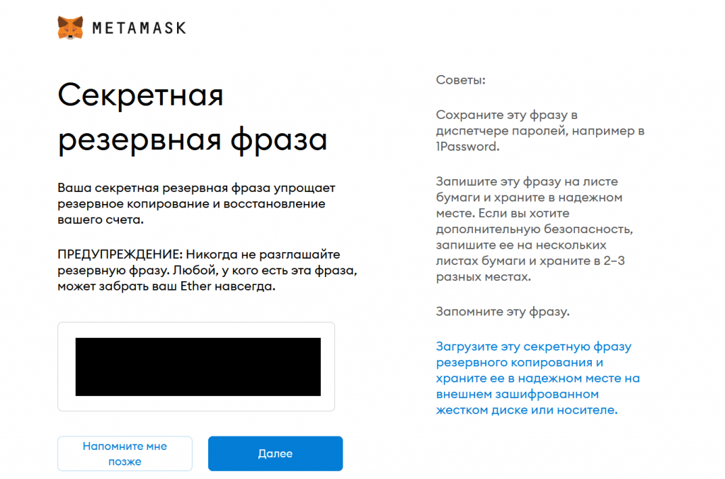 - Сохраните резервные фразы, чтобы не потерять доступ к кошельку.