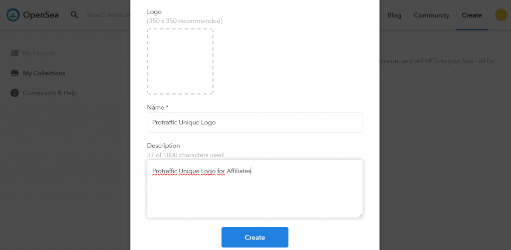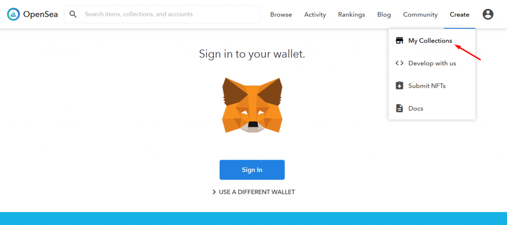 - Нажмите «Create Collection» в главном меню OpenSea.