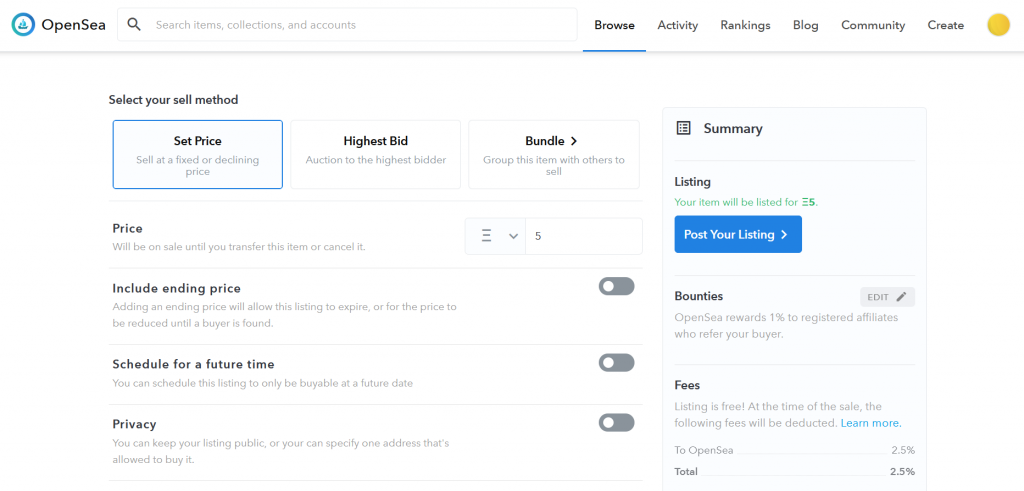 Со стороны продавца OpenSea предлагает очень разумную структуру комиссионных: вы не платите комиссию за размещение своего объекта, а связанные с этим транзакционные издержки несут покупатели.