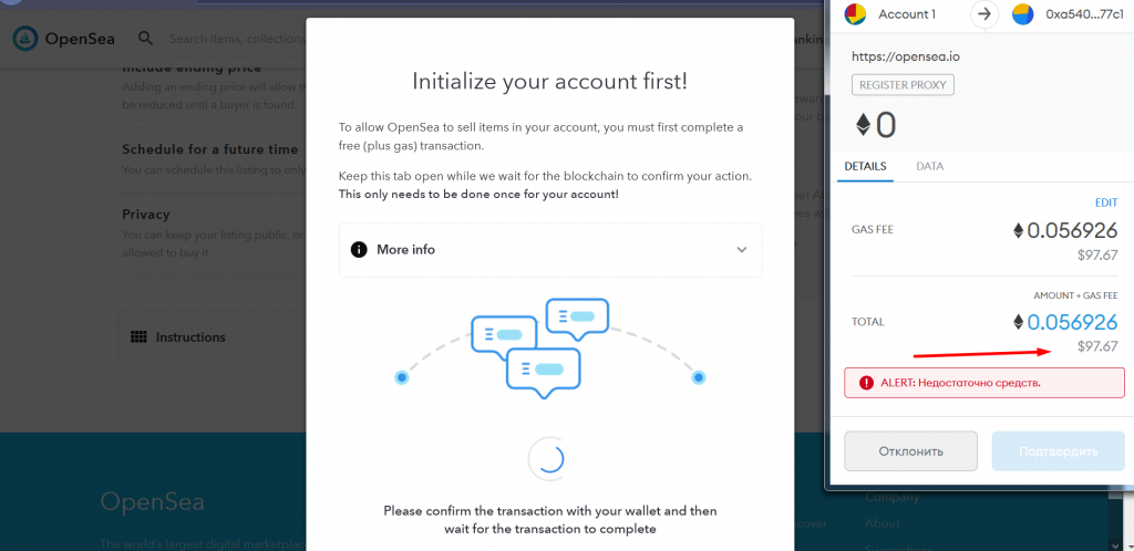 Чтобы позволить OpenSea продавать предметы от вашего имени оплатите комиссию за транзакцию в сети Ethereum. В нашем случае сумма составляет $97 или 7 426 рублей.