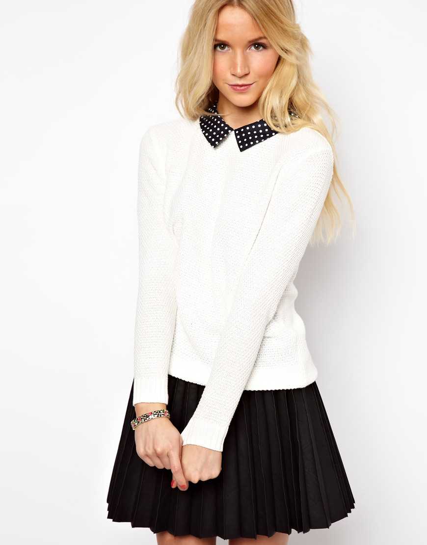 Самый универсальный среди универсальных свитеров – белый джемпер. С чем его носить, чтобы создать интересный образ? С милой, напоминающей школьную форму, юбочкой. Под джемпер можно одеть рубашку, выпустив поверх воротничок.