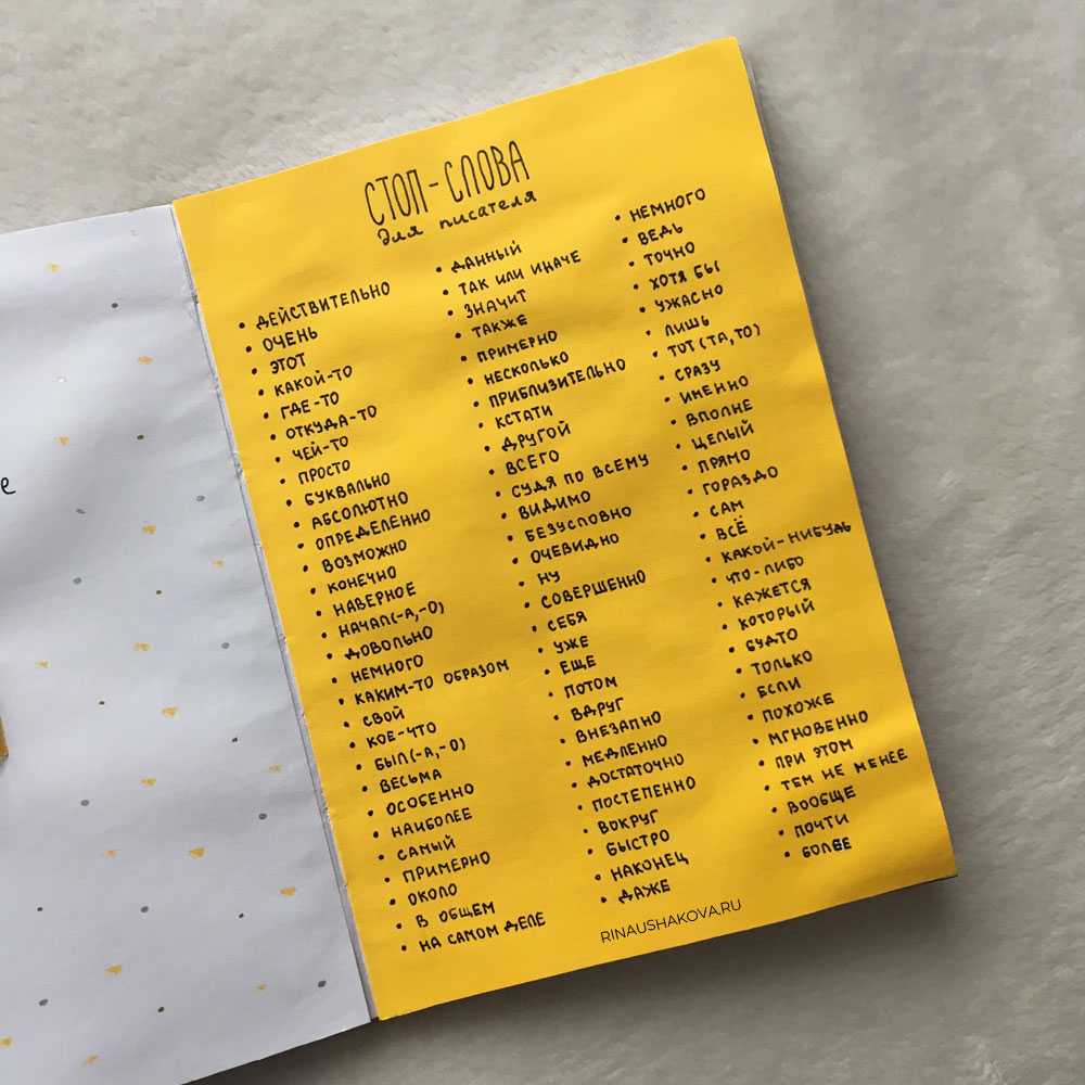 Стоп-слов огромное количество, но у каждого из нас есть те, которые сопровождают нас всю жизнь. Чтобы понять, какие особенно дороги твоему сердцу, придется попотеть. Первый вариант: открыть список слов-паразитов и выписывать те, которые, как тебе кажется, ты используешь чаще всего. Второй вариант, для тех, кто уже хорошо знаком с этим списком: открыть свою рукопись и выписать из нее все часто повторяющиеся стоп-слова.