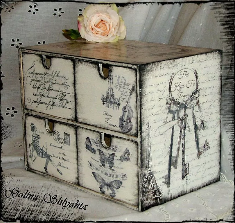 2. Декупаж- декорирование старых вещей. Очень красивые и самобытные шкатулки, сундуки, разделочные доски, вазы, часы, да и по большому счету все, что угодно. Привлекательность предмета, как всегда, имеет прямую зависимость от руки и фантазии мастера.