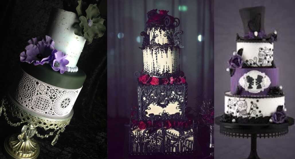 Готическая свадьба подразумевает и необычное оформление сладостей. Свадебный торт может представлять собой настоящий кондитерский шедевр с декором из черепов, черных цветов, цепей или замка. Черный шоколад в сочетании с белым и красным создадут незабываемый свадебный десерт.