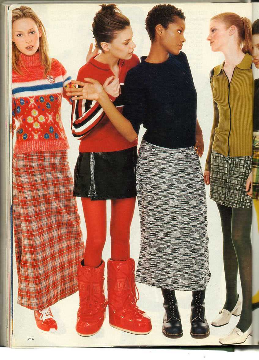 В музыке на смену гранжу пришло новое направление – рейв. Это электронная музыка, неотъемлемой частью которой были нон-стоп вечеринки и наркотики. Неизбежно это повлияло на модные тенденции в одежде. Популярными стали кислотные цвета, винил и пластик, супермини, футболки и топы с психоделическими рисунками, туфли на огромной платформе, яркие прически и макияж.