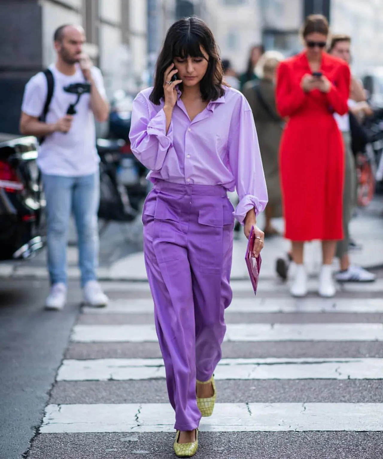 На первый взгляд может показаться, что яркий красный цвет полностью поглотит нежный светлый оттенок Very Peri. Однако стилисты успешно доказывают обратное, предлагая модницам смело сочетать эти два контрастных цвета. Красиво и элегантно будет смотреться как монохромный лиловый наряд с красными аксессуарами и обувью, так и деловой аутфит, состоящий из ярких брюк, лаконичной рубашки и пиджака.