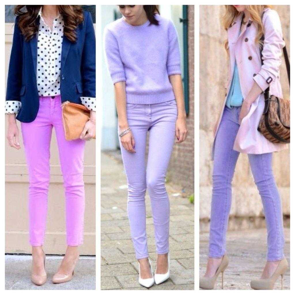 Наиболее гармонично смотрятся комплекты с бледно-розовым, голубым и персиковым. Они помогают обыграть розовый цвет, который скрывается в темно или светло-сиреневом. Девушка, решившаяся на это сочетание, будь то брюки или юбка, выглядит особенно романтично и, конечно же, стильно.