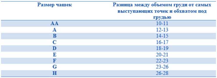 Этап №2: определить размер чашки бюстгальтера по буквам, можно, узнав разницу между объемом груди и объемом под грудью. Определенному диапазону разницы объемов в сантиметрах соответствует буквенное обозначение чашки: