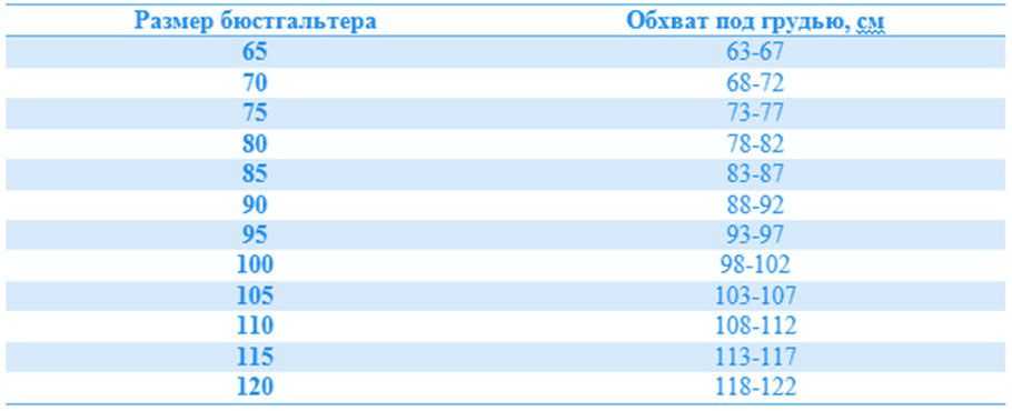 Этап №1: зная обхват под грудью, можно определить размер лифчика, подобрав самое близкое число, как показано в таблице: