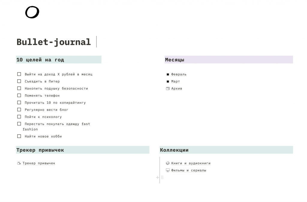 В Notion можно перенести ваш бумажный блокнот или привычный таск-менеджер. Допустим, вы используете систему bullet journal — в Notion можно повторить структуру блокнота: вот как сделали мы.