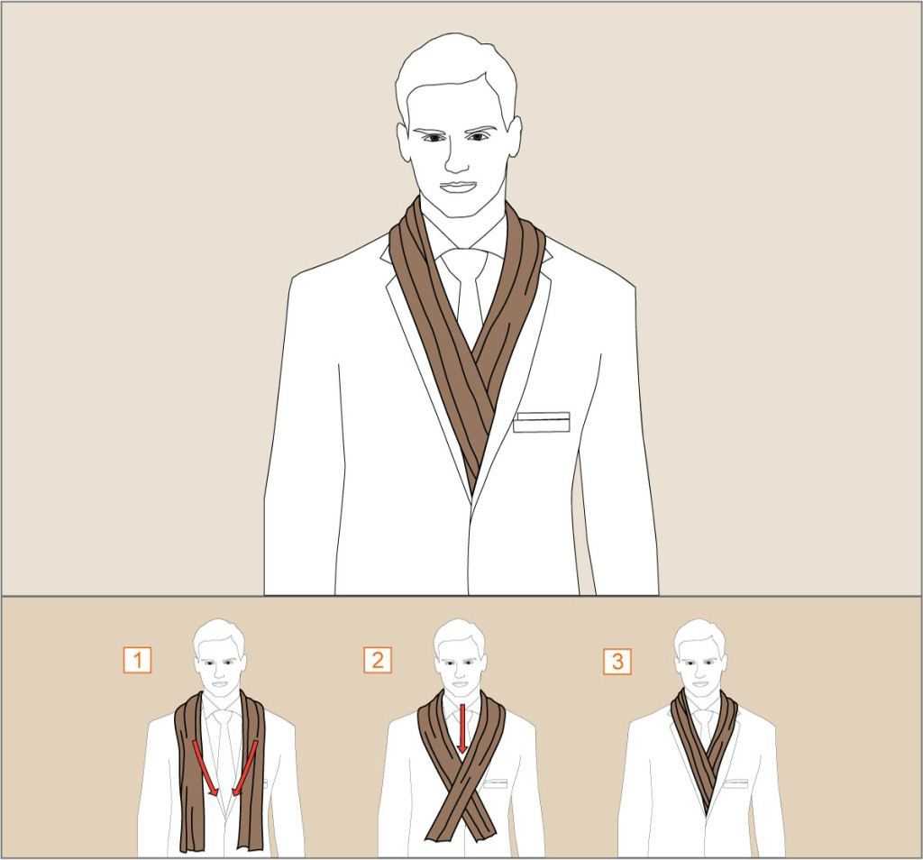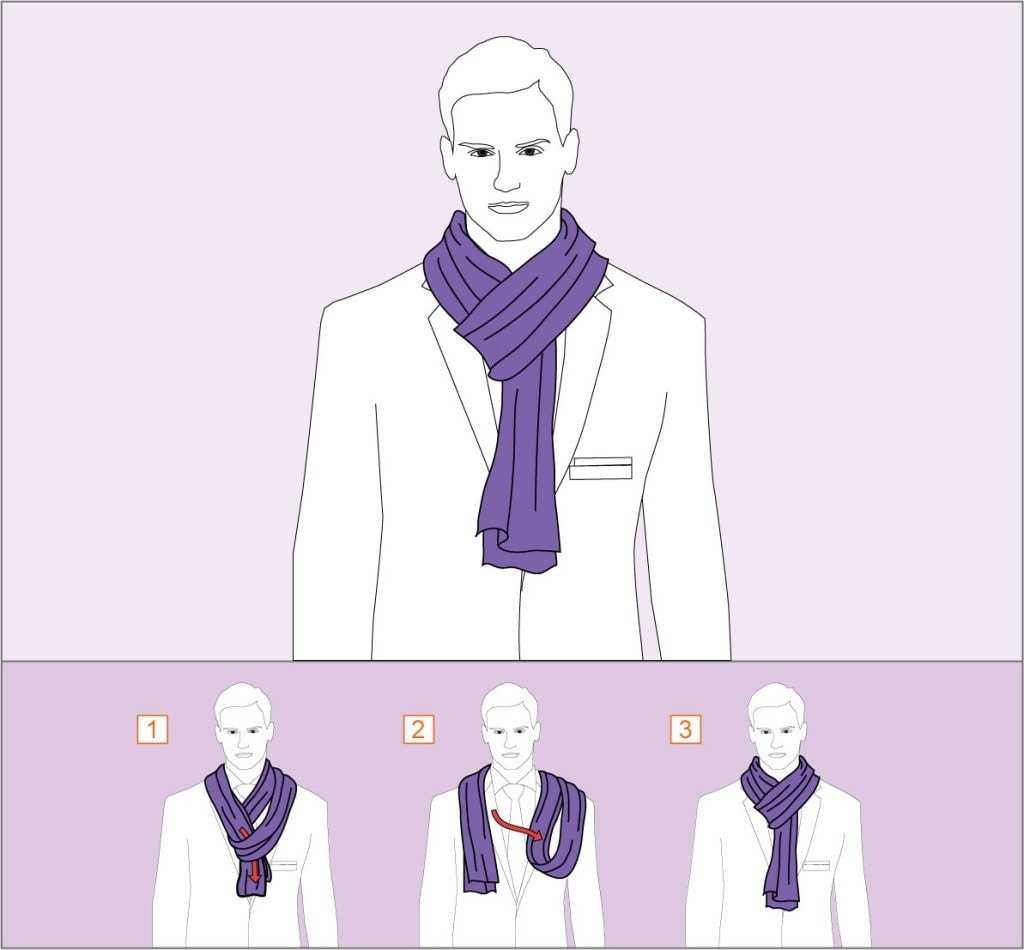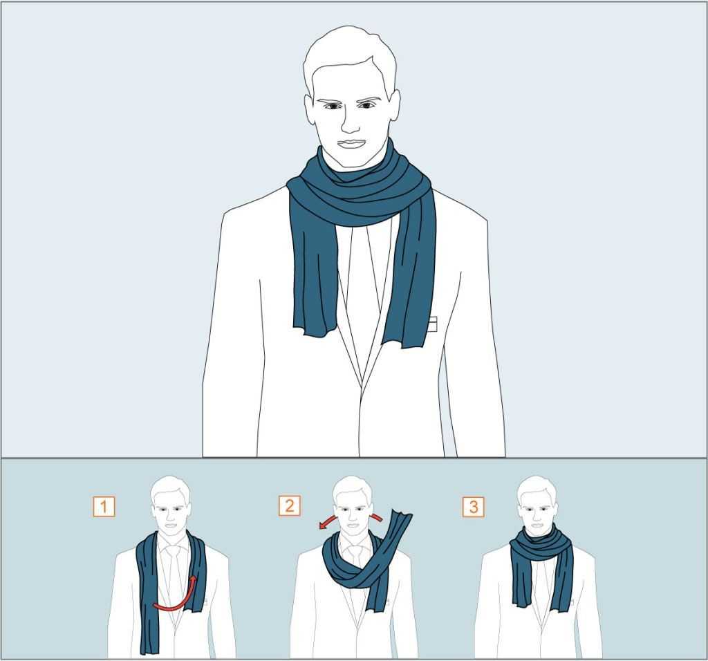 Такой способ завязать шарф, поможет мужчине пережить любую ненастную погоду. Холодный ветер или лютый мороз вам не страшны, если обернуть шарф вокруг шеи два раза. Однако для такого способа потребуется очень длинный шарф, не менее 150-170 см.