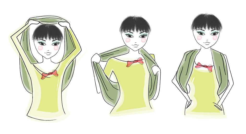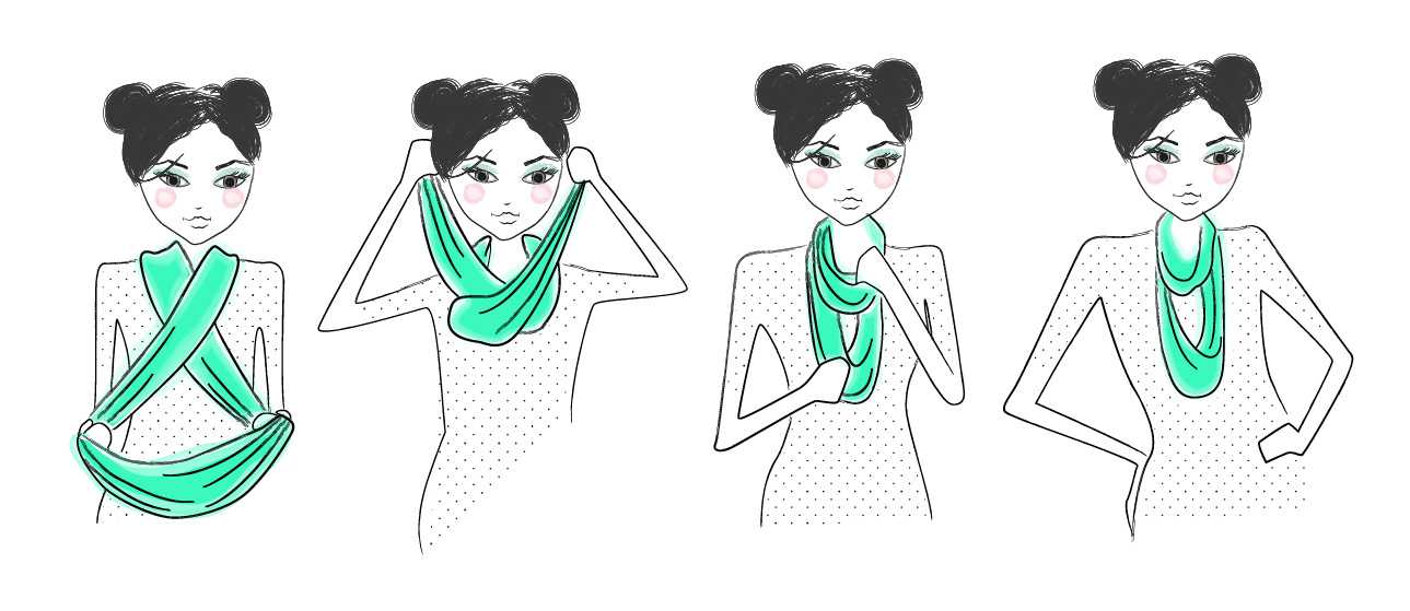 Как завязать шарф: положите шарф на плечи, так, чтобы один конец был на уровне груди, а второй конец оберните вокруг шеи два раза, закрывая все открытые участки шеи. Для фиксации концов, зафиксируйте их между слоями шарфа.