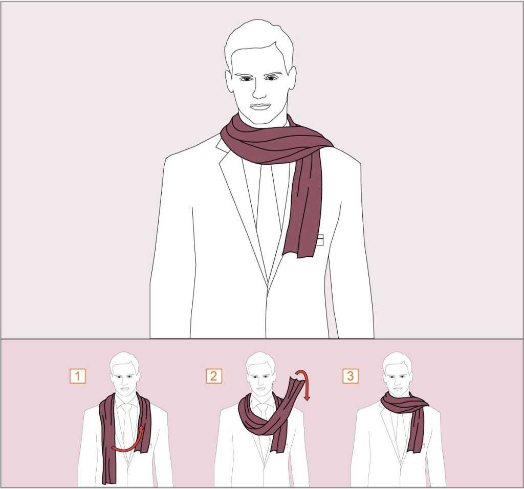 Один из простых способов, как завязать шарф мужчине. К шарфу нет особых требований, подойдет любой среднестатистический шарф. Отлично подходит для холодной зимы, т.к. не остается зазоров, куда может проникнуть холодный воздух.