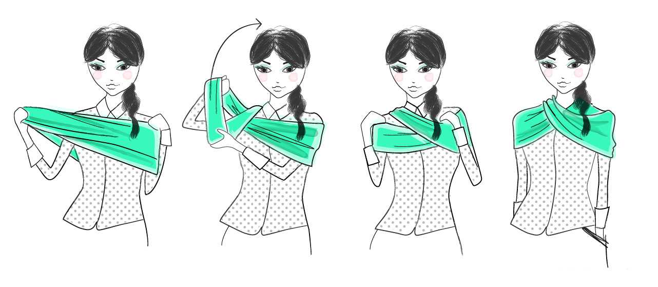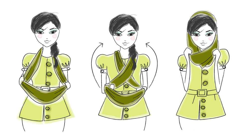 Как завязать шарф: возьмите платок или шарф и положите его на плечи. Скрестите оба конца шарфа и загните вовнутрь тот конец, который оказался под верхним. Далее следует поправить узел, чтобы он не душил вас, но и не болтался около груди.