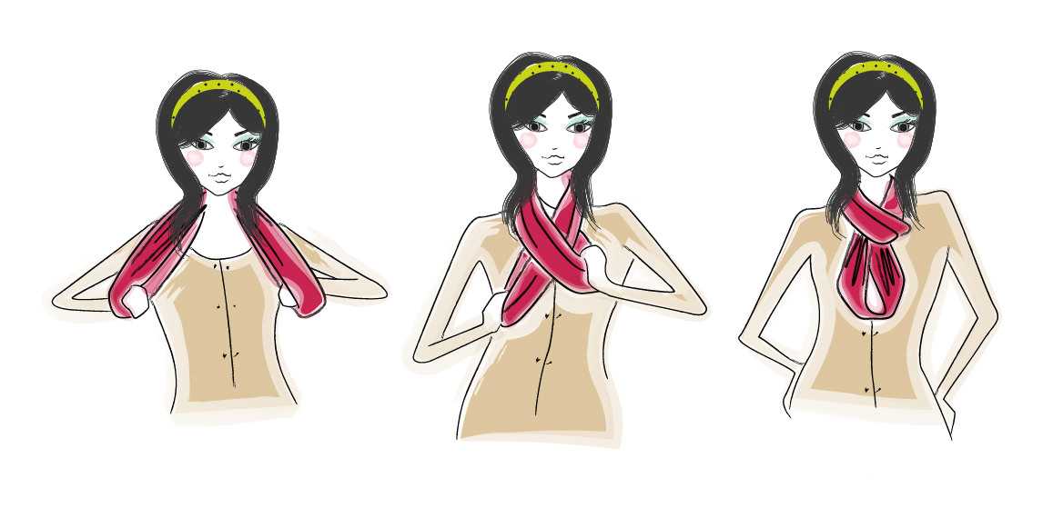 Как завязать шарф: сложите шарф пополам, после чего закиньте шарф за шею, держа по одному концу в каждой руке. Затем сложенные концы продеваются через образовавшуюся петлю и затягиваются, для достижения комфортного и плотного прилегания.