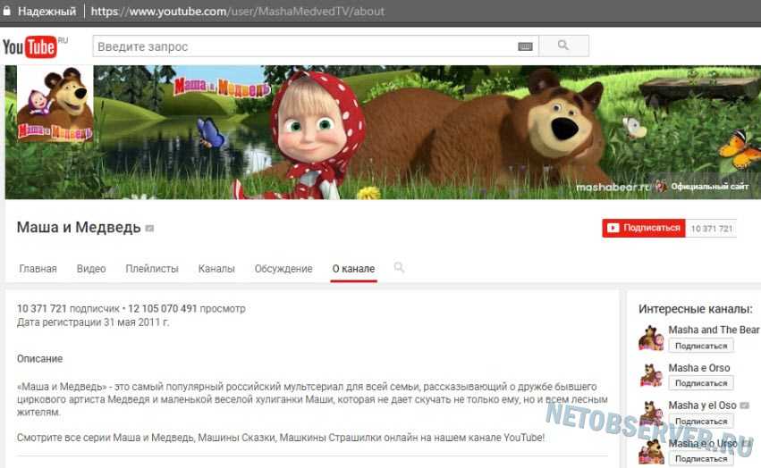 Причины популярности и второго места в рейтинге российских каналов YouTube, полагаем, в сильных пояснениях не нуждаются: «Маша и Медведь» заслуженно пользуется вниманием семей с детьми благодаря очень качественному исполнению: менее чем за 10 минут детям рассказывается очередная интересная, увлекательная и смешная история с самобытными и горячо любимыми героями. Озорная Маша и бедняга Мишка, глядя на приключения которых любой начнет улыбаться – это железобетонное доказательство того, что российская анимационная школа не только не растеряла достояния советского прошлого, но и способна делать современный продукт, который будет близок каждому ребенку, на каком языке бы он ни говорил
